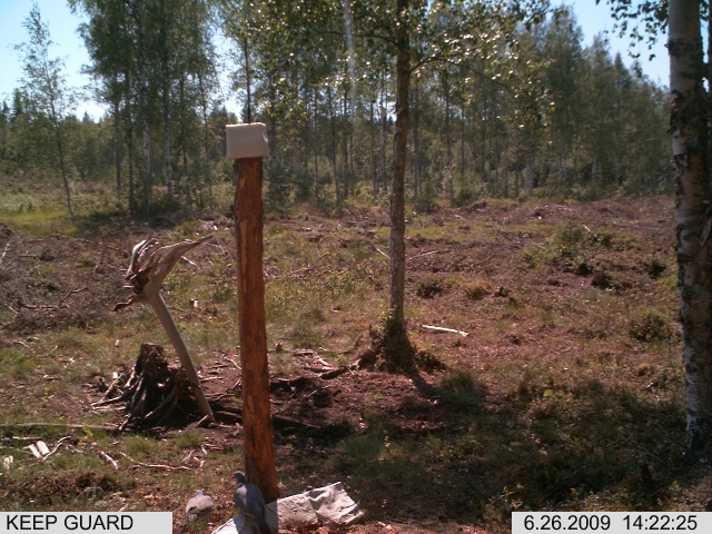 Pari kyyhkystä. Tolpan juurelle on viime syksynä tuotu säkillinen kauraa, joten kyyhkyset käyvät sitä syömässä.