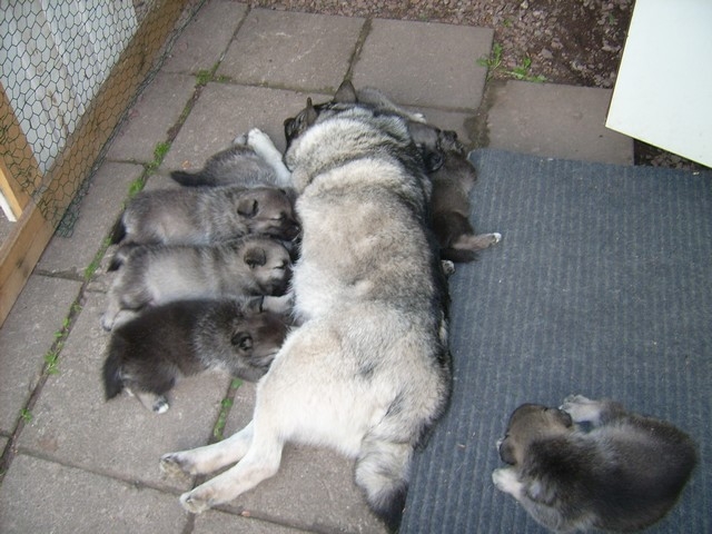Tähtisen Keijon norjanharmaahirvikoira Pella imettää jälkikasvuaan. Pella synnytti 5 narttua ja 2 urosta.