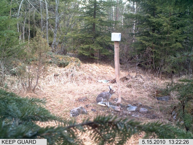 Sama metsäjänis kuin eilenkin. Tänään se vieraili kiven juurella neljä kertaa.
