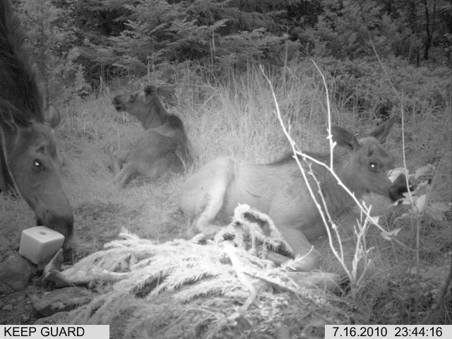 Emä tuplavasojen kanssa jälleen kivellä. Vasat ottivat rennosti ja söivät ruohoa.