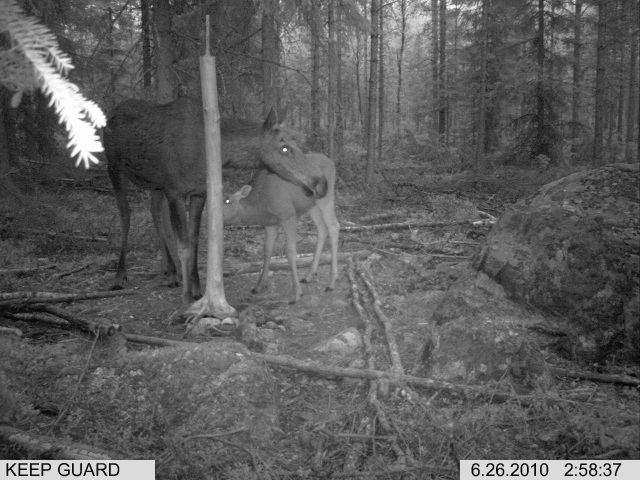 Lehmä (Aune) yhden vasan kanssa. Nämä hirvet vierailivat kaikkein ahkerimmin nuolukivellä eri vasaporukoista.